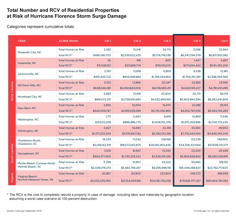 Hurricane Florence is imminently making landfall, with the Category 4 storm (at press time) on track to batter the Carolinas and parts of Virginia, causing catastrophic damage in the region. According to CoreLogic preliminary projections, an estimated 758,657 homes could be devastated by the hurricane's storm surge, and reconstruction could total up to $170.2 billion.